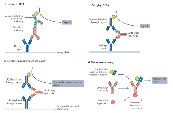 因于免疫原性会严重影响药物的有效性和安全性,药监部门要求所有生物治疗性药物都要进行免疫原性检测,FDA对免疫原性的检测给出的具体要求:高灵敏度、高特异性、高稳定性及高亲和力。ADA的检测和确认比较复杂,检测结果会受到所使用的分析方法的影响。目前评估免疫原性的方法学包括不同类型的免疫分析平台:如传统酶联免疫吸附分析(ELISA, 图1a、b)、电化学发光免疫分析(ECL, 图1c )和放射免疫分析(RIA, 图1d),以及不同的ELISA检测形式,如直接、间接、桥接和竞争ELISA等。