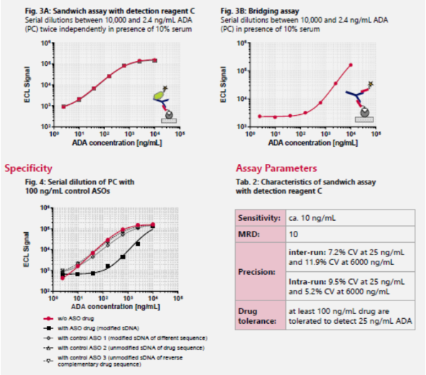 FyoniBio基于Meso Scale Discovery (MSD) 的电化学发光(ECL)平台检测临床样品中的ADA。并分别对桥式和双抗夹心ELISA形式进行检测评估。在酸解预处理后,使用生物素化的ASO药物作为捕获试剂,然后将待检样本加到链霉亲和素涂布的平板上,钌离子(sTAG)标记的ASO药物或检测试剂A、B和C用于检测(图2)。